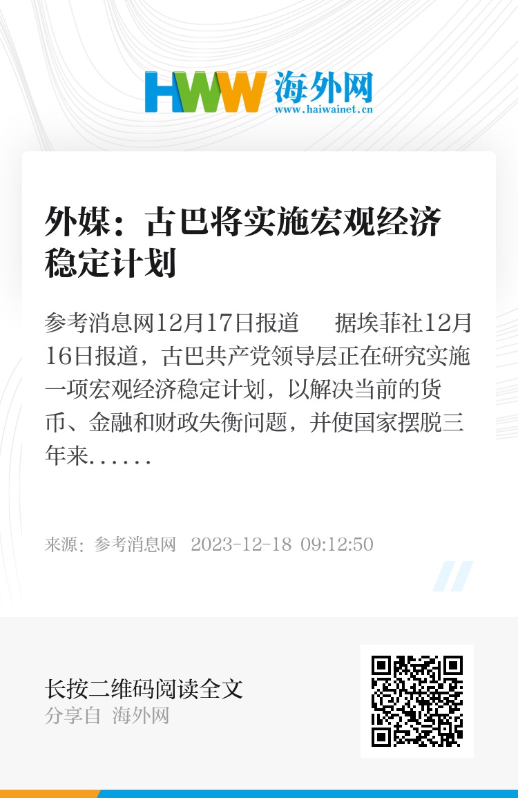 参考消息网12月17日报道 据埃菲社12月16日报道,古巴共产党领导层正在研究实施一项宏观经济稳定计划,以解决当前的货币、金融和财政失衡问题,并使国家摆脱三年来所遭受的危机。
