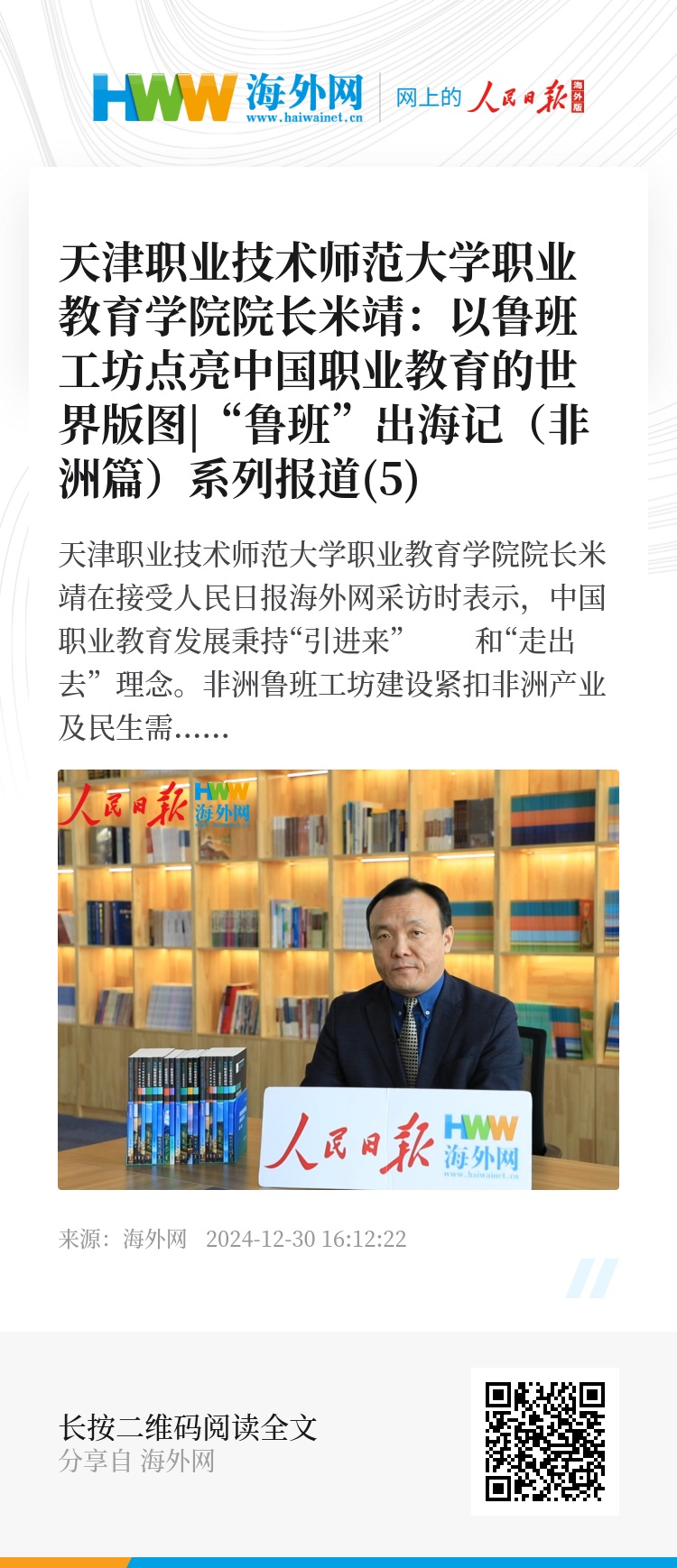 天津职业技术师范大学职业教育学院院长米靖在接受人民日报海外网采访时表示,中国职业教育发展秉持“引进来” 和“走出去”理念。非洲鲁班工坊建设紧扣非洲产业及民生需求,输出天津优质职教资源与理念,通过师资先行,强化本土师资教学能力,培养大量技术技能人才,支持当地产业发展。