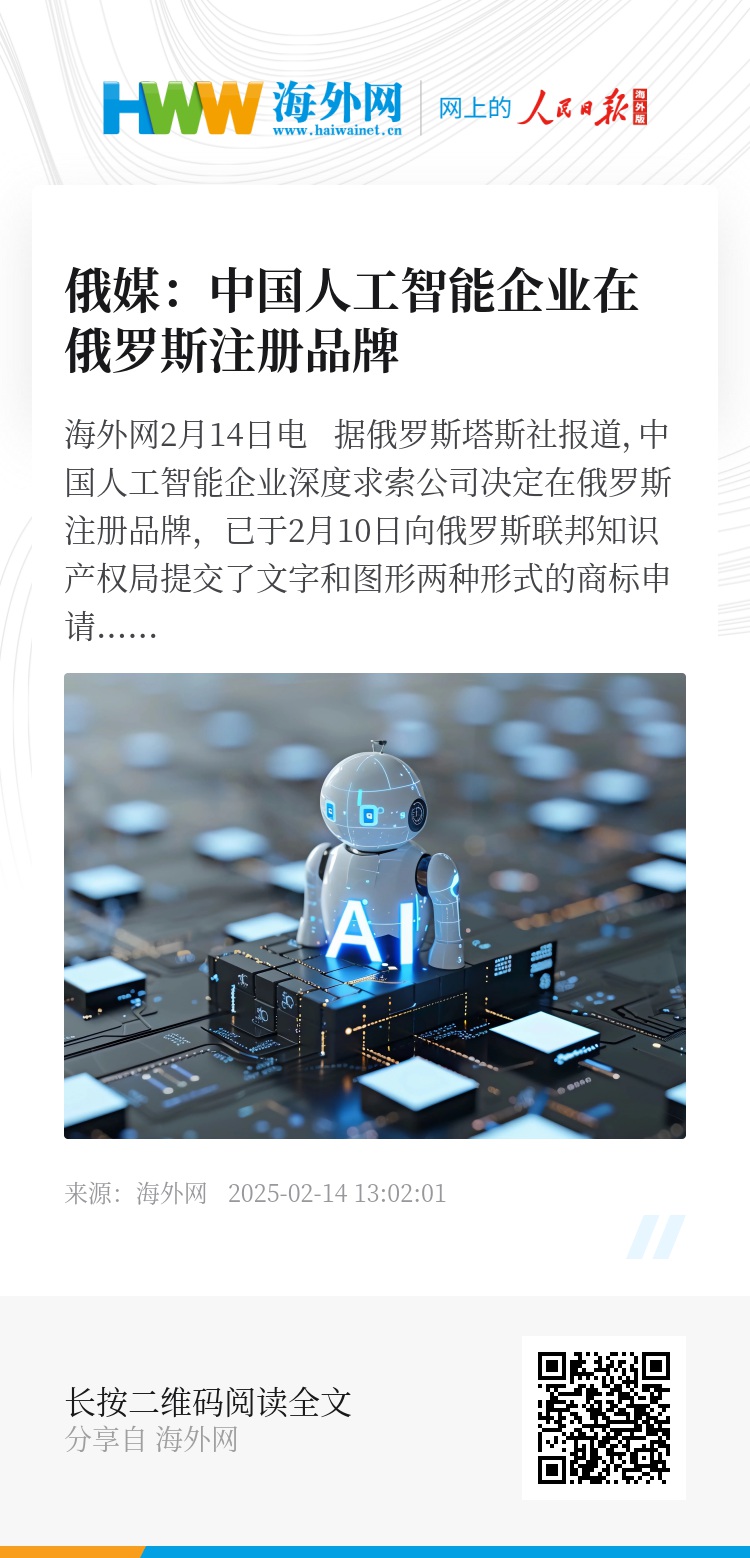 海外网2月14日电 据俄罗斯塔斯社报道,中国人工智能企业深度求索公司决定在俄罗斯注册品牌,已于2月10日向俄罗斯联邦知识产权局提交了文字和图形两种形式的商标申请。