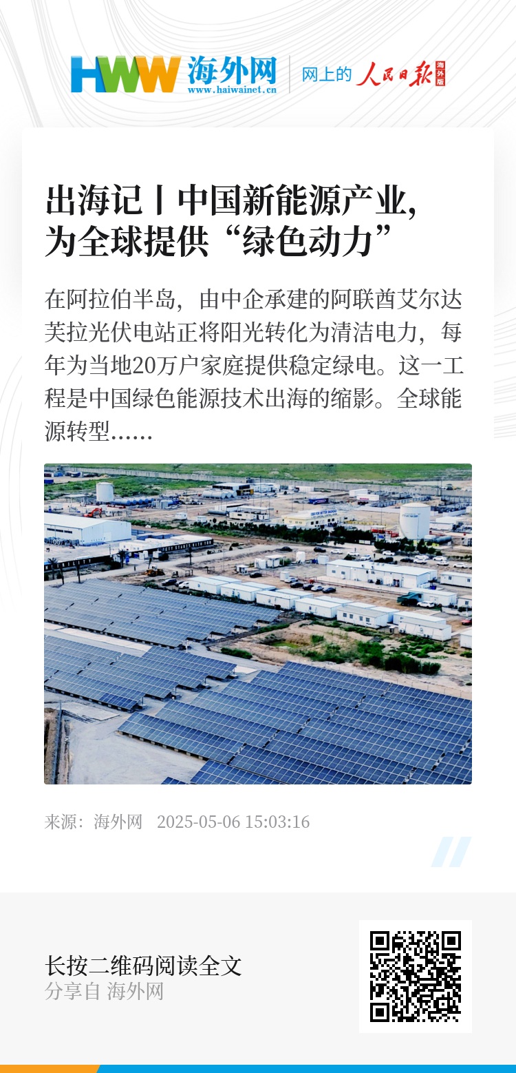 在全球能源技术革新的浪潮中,中国以技术为舟,以合作为帆,将绿色能源出海从产品输出迈向生态共建。能源转型是一场需要全球合力的马拉松,中国在绿色赛道上跑出加速度,正为全球可持续发展贡献“中国智慧”。(海外网 陈伟栋)