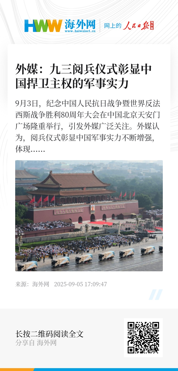 “九三阅兵仪式传递出了强烈的威慑信息。”阿联酋《今日海湾》注意到,中国举行了有史以来规模最大的阅兵仪式,展示出具有全球影响力的战略核导弹、激光武器、高超声速导弹等。一名分析师表示:“中国在军事技术等综合方面优势显著。”报道称,新组建的军事航天、网络空间和信息支援部队也参加了阅兵仪式,表明中国在发展先进太空和电子战领域的决心。