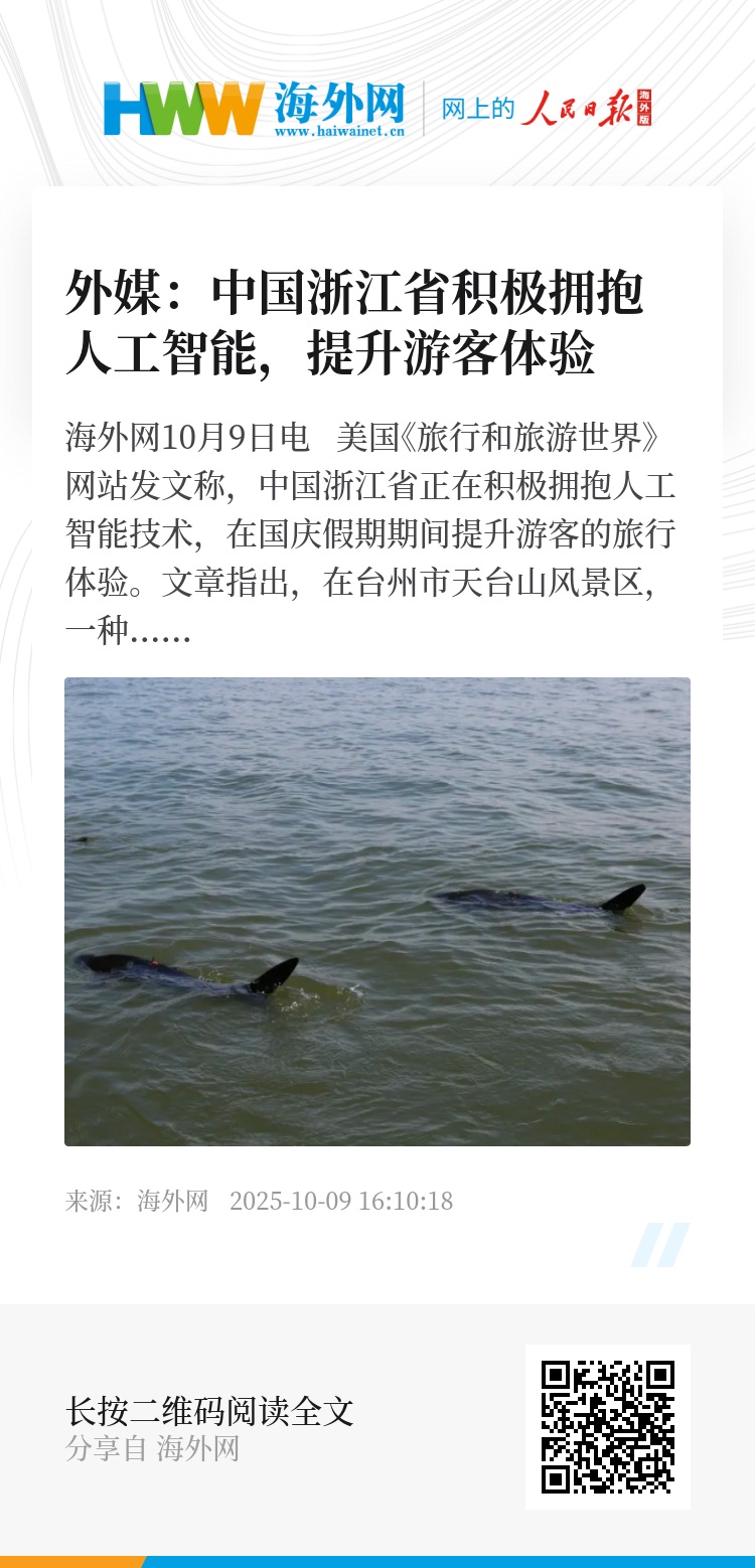 海外网10月9日电 美国《旅行和旅游世界》网站发文称,中国浙江省正在积极拥抱人工智能技术,在国庆假期期间提升游客的旅行体验。
