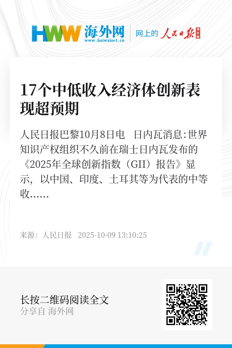 人民日报巴黎10月8日电 日内瓦消息:世界知识产权组织不久前在瑞士日内瓦发布的《2025年全球创新指数(GII)报告》显示,以中国、印度、土耳其等为代表的中等收入经济体创新增长势头强劲,部分经济体在技术应用和产业转型方面表现突出;共有17个中低收入经济体创新表现超预期,在全球创新版图中占据重要位置。
