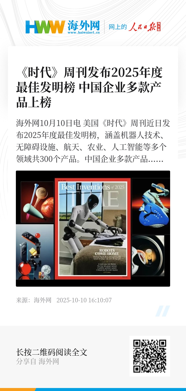 海外网10月10日电 美国《时代》周刊近日发布2025年度最佳发明榜,涵盖机器人技术、无障碍设施、航天、农业、人工智能等多个领域共300个产品。中国企业多款产品上榜,包括宇树科技、DeepSeek、华为以及比亚迪等。