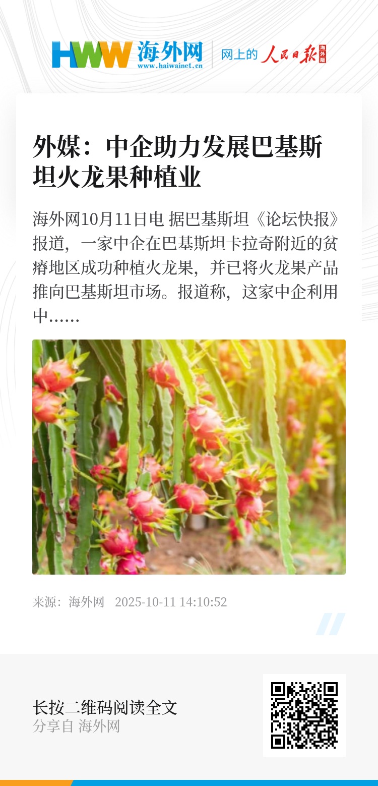 海外网10月11日电 据巴基斯坦《论坛快报》报道,一家中企在巴基斯坦卡拉奇附近的贫瘠地区成功种植火龙果,并已将火龙果产品推向巴基斯坦市场。