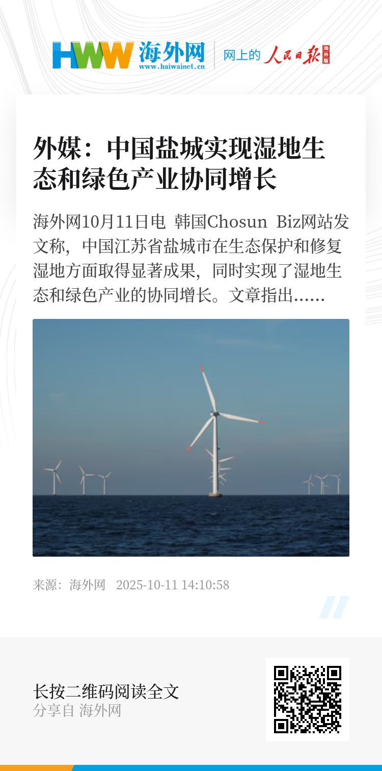 海外网10月11日电 韩国Chosun Biz网站发文称,中国江苏省盐城市在生态保护和修复湿地方面取得显著成果,同时实现了湿地生态和绿色产业的协同增长。