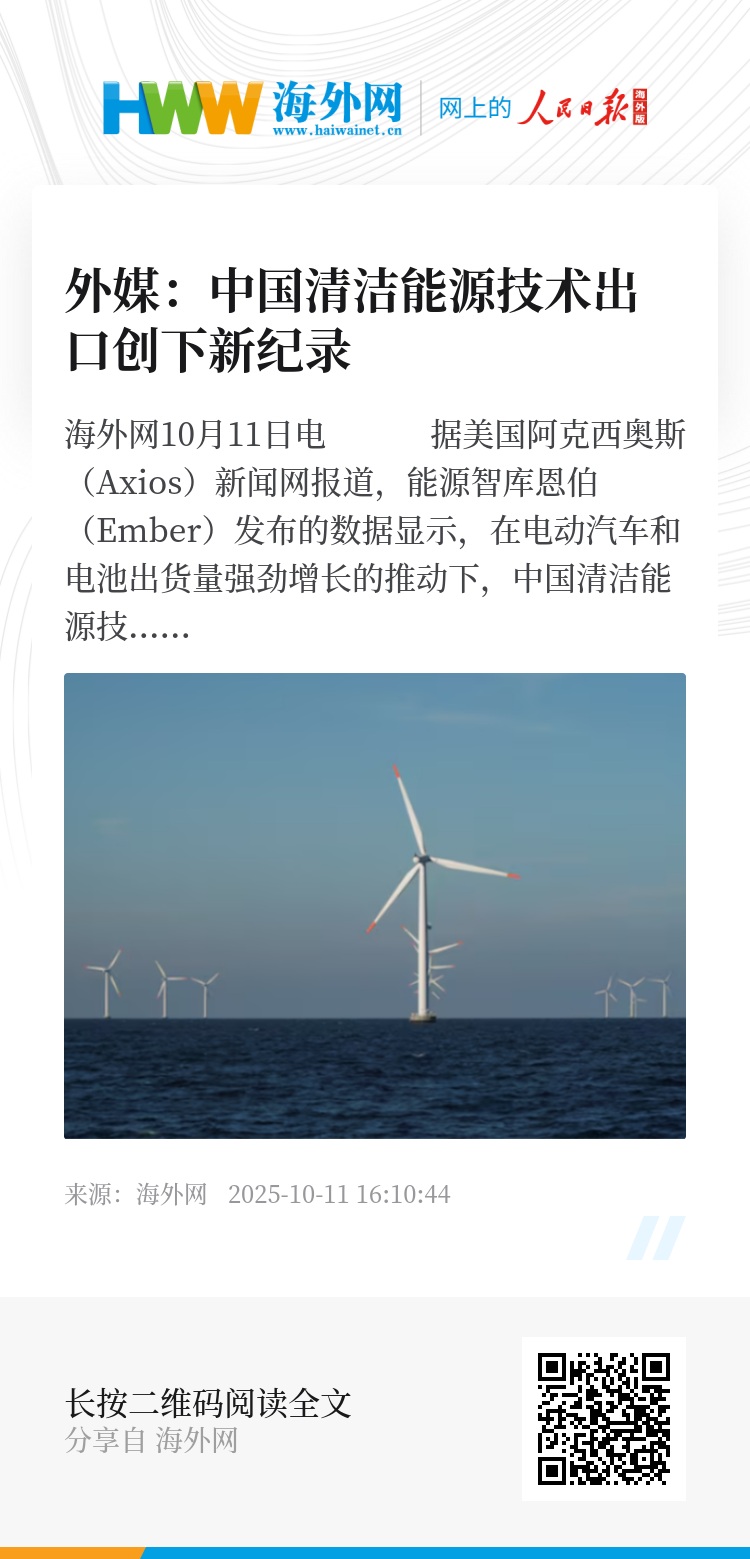 海外网10月11日电 据美国阿克西奥斯(Axios)新闻网报道,能源智库恩伯(Ember)发布的数据显示,在电动汽车和电池出货量强劲增长的推动下,中国清洁能源技术出口创下新纪录。