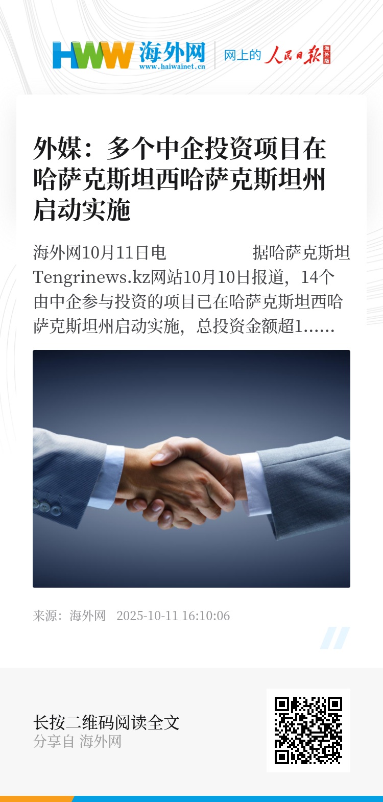 海外网10月11日电 据哈萨克斯坦Tengrinews.kz网站10月10日报道,14个由中企参与投资的项目已在哈萨克斯坦西哈萨克斯坦州启动实施,总投资金额超1340亿坚戈(约合人民币17.79亿元),资金将投向能源、农业、炼油及医疗保健领域。