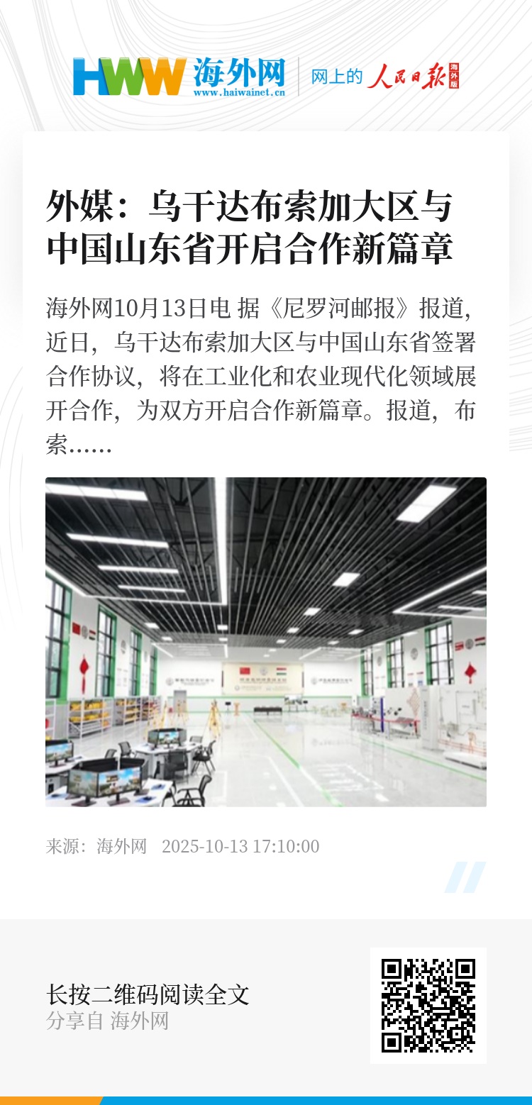 海外网10月13日电 据《尼罗河邮报》报道,近日,乌干达布索加大区与中国山东省签署合作协议,将在工业化和农业现代化领域展开合作,为双方开启合作新篇章。