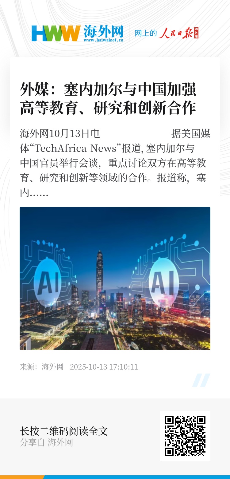 报道称,塞内加尔官员赞扬了两国之间的长期伙伴关系,并强调了高等教育、研究和创新在人力资本能力建设方面的战略作用,塞内加尔希望加强与中国在人工智能、科技进步和工业化方面的合作。中国官员表示,中国愿意深化与塞内加尔的合作,将在数字化、人工智能和职业培训等领域向塞内加尔提供帮助。(海外网 李芳)