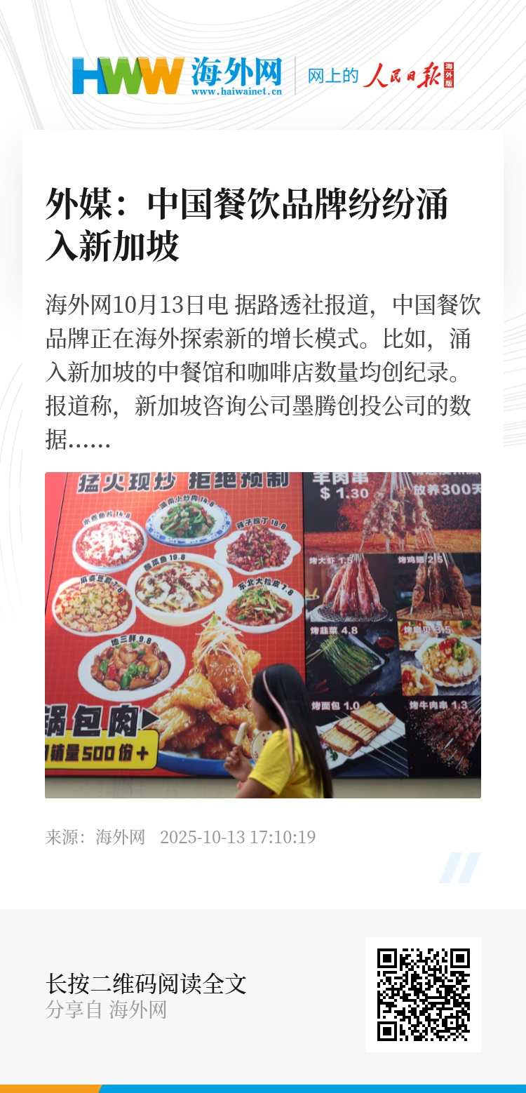 海外网10月13日电 据路透社报道,中国餐饮品牌正在海外探索新的增长模式。比如,涌入新加坡的中餐馆和咖啡店数量均创纪录。