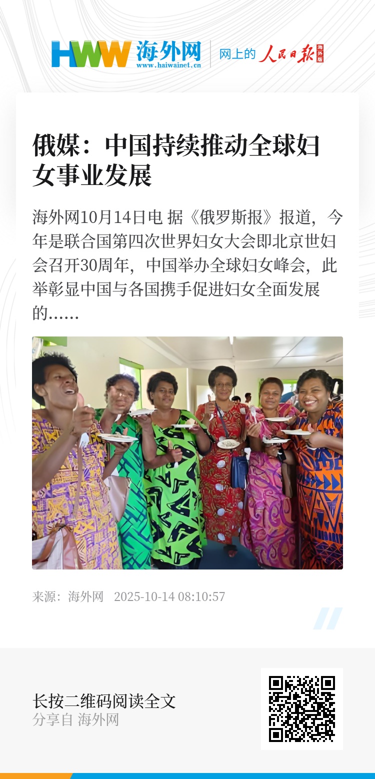 海外网10月14日电 据《俄罗斯报》报道,今年是联合国第四次世界妇女大会即北京世妇会召开30周年,中国举办全球妇女峰会,此举彰显中国与各国携手促进妇女全面发展的决心,中国正持续推动全球妇女事业进步。