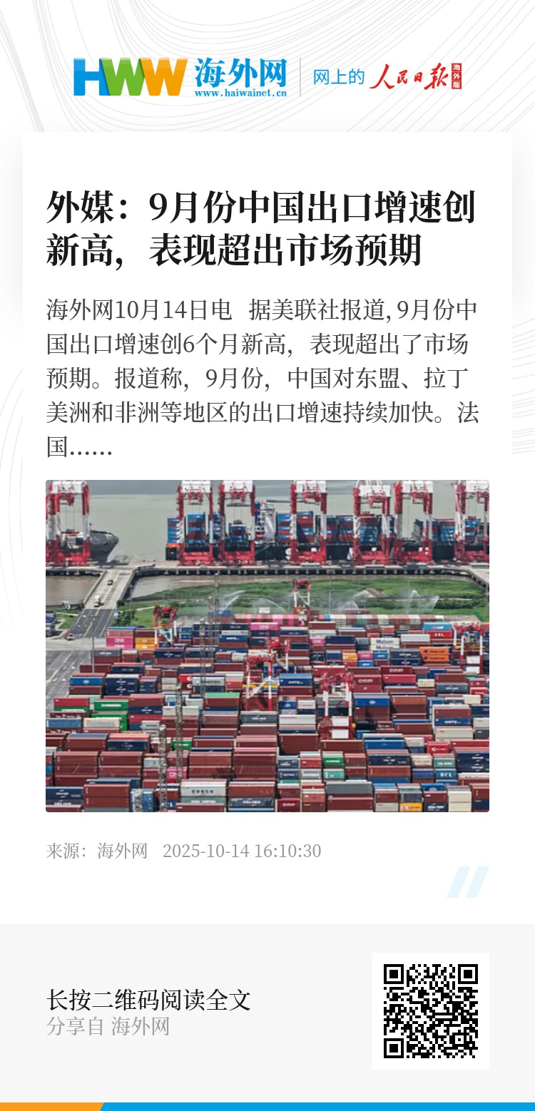 海外网10月14日电 据美联社报道,9月份中国出口增速创6个月新高,表现超出了市场预期。