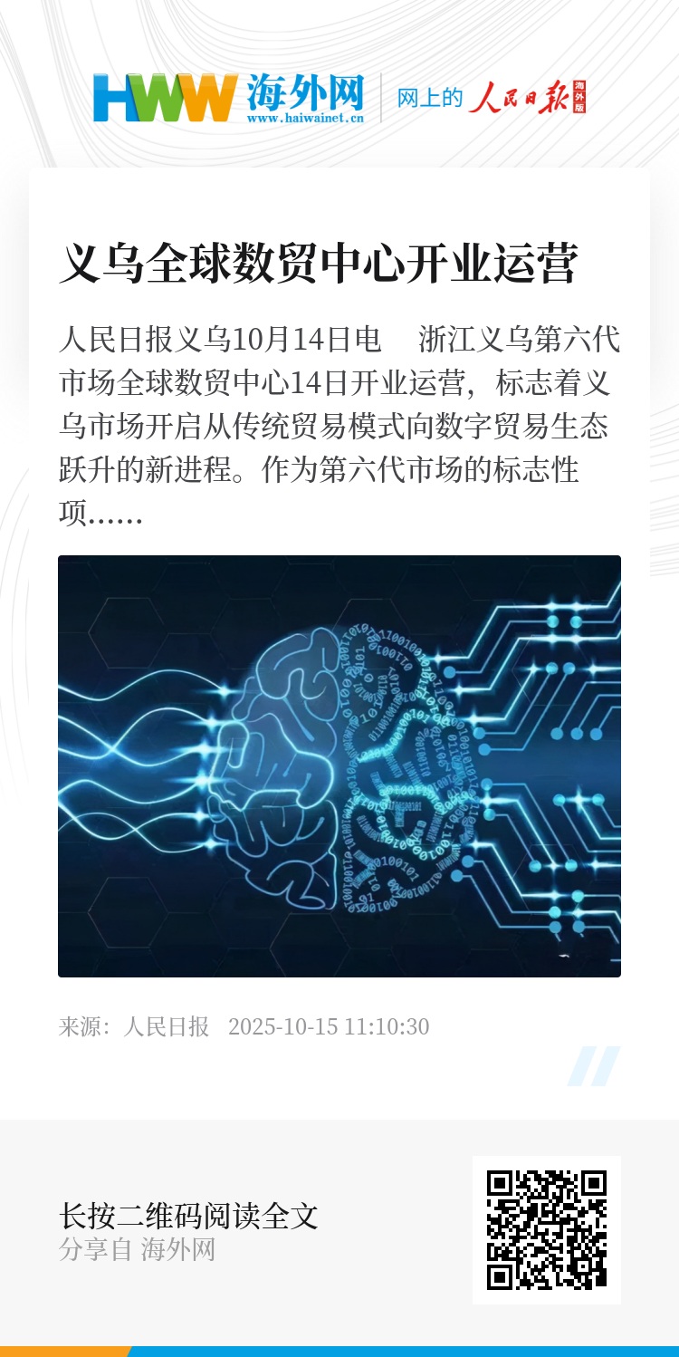 人民日报义乌10月14日电 浙江义乌第六代市场全球数贸中心14日开业运营,标志着义乌市场开启从传统贸易模式向数字贸易生态跃升的新进程。