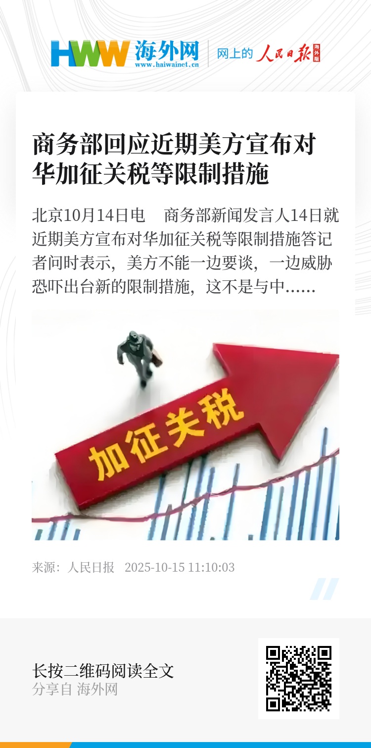 发言人说,中方注意到有关情况。近日,中方已就美威胁对华加征100%关税等限制措施阐明了有关立场。我愿重申,关于稀土等相关物项的出口管制措施,是中国政府依据法律法规,完善自身出口管制体系的正当做法。中国作为负责任大国,始终坚定维护自身国家安全和国际共同安全,中国的出口管制不是禁止出口,对符合规定的申请将一如既往地予以许可,共同维护全球产供链安全稳定。措施出台前,中方已通过双边出口管制对话机制向美方进行了通报。反观美方,长期泛化国家安全,滥用出口管制,对华采取歧视性做法。特别是中美马德里经贸会谈以来美方持续新增出台一系列对华限制措施,严重损害中方利益,严重破坏双方经贸会谈氛围,中方对此坚决反对。