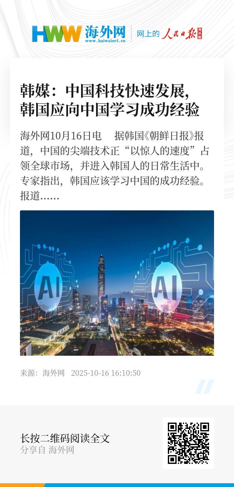 海外网10月16日电 据韩国《朝鲜日报》报道,中国的尖端技术正“以惊人的速度”占领全球市场,并进入韩国人的日常生活中。专家指出,韩国应该学习中国的成功经验。