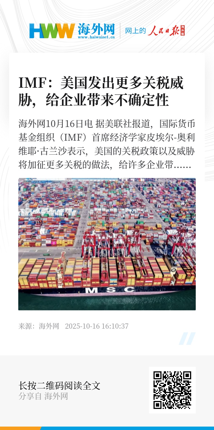海外网10月16日电 据美联社报道,国际货币基金组织(IMF)首席经济学家皮埃尔-奥利维耶·古兰沙表示,美国的关税政策以及威胁将加征更多关税的做法,给许多企业带来持续的不确定性,也给世界经济带来了压力。