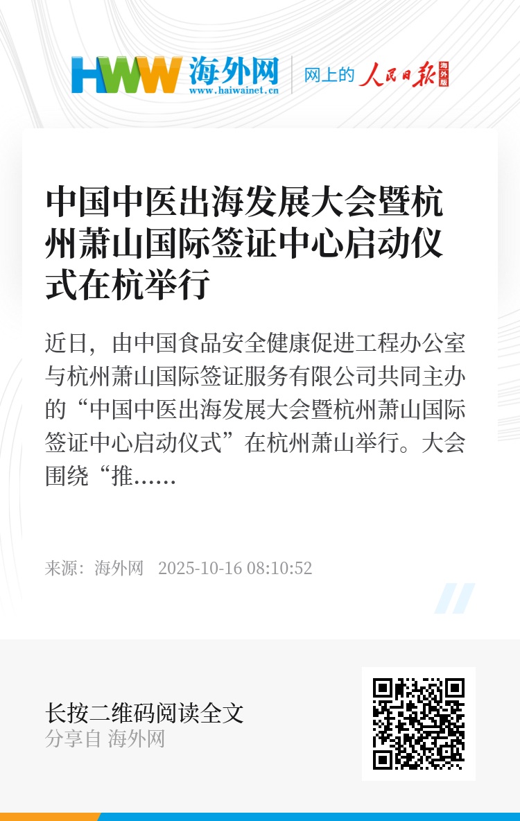 近日,由中国食品安全健康促进工程办公室与杭州萧山国际签证服务有限公司共同主办的“中国中医出海发展大会暨杭州萧山国际签证中心启动仪式”在杭州萧山举行。大会围绕“推动中医更好、更深融入世界,参与全球健康治理,增进全人类健康福祉”展开深入交流,吸引了近300位嘉宾参与,其中包括政府机构、驻华使领馆及国际组织代表,以及中医药企业、金融机构、旅游企业和新闻媒体界的代表。