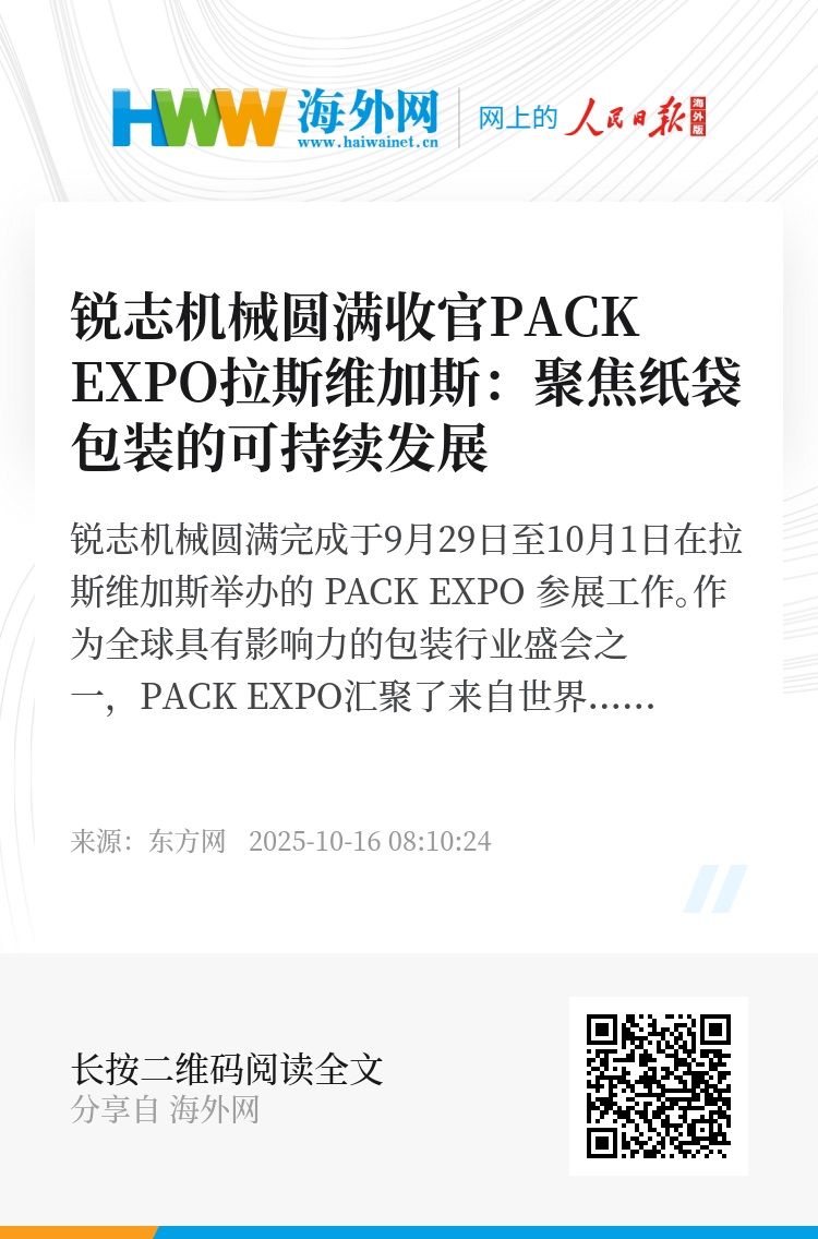 锐志机械圆满完成于9月29日至10月1日在拉斯维加斯举办的 PACK EXPO 参展工作。作为全球具有影响力的包装行业盛会之一,PACK EXPO汇聚了来自世界各地的制造商、供应商与专业买家,为锐志机械展示纸袋机解决方案与场景化应用提供了高质量平台。