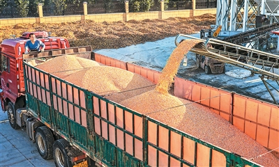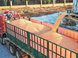 正值秋粮收获关键期,山东省乐陵市积极组织协调各粮食收储企业,充分利用现代化烘干设备和智能化储粮技术,开足马力抢烘抢储,全力保障秋粮颗粒归仓、安全存储。图为工作人员将烘干的玉米装车收储。