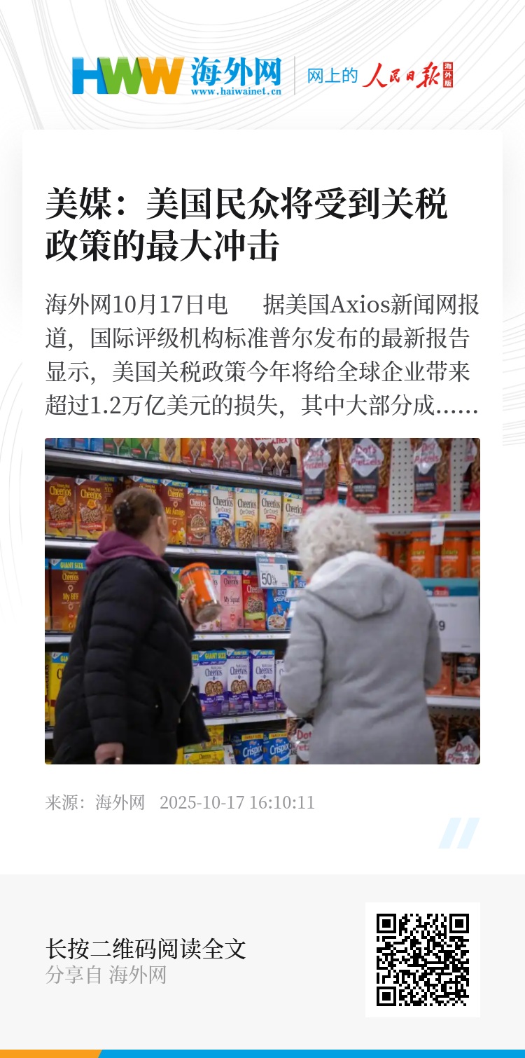 海外网10月17日电 据美国Axios新闻网报道,国际评级机构标准普尔发布的最新报告显示,美国关税政策今年将给全球企业带来超过1.2万亿美元的损失,其中大部分成本将转嫁给消费者。