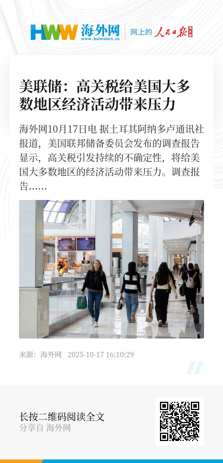 海外网10月17日电 据土耳其阿纳多卢通讯社报道,美国联邦储备委员会发布的调查报告显示,高关税引发持续的不确定性,将给美国大多数地区的经济活动带来压力。