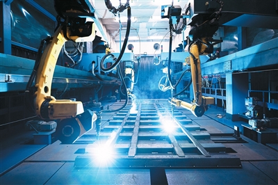 工业机器人在中国重汽集团湖北华威专用汽车有限公司自卸车智能化生产线上作业。