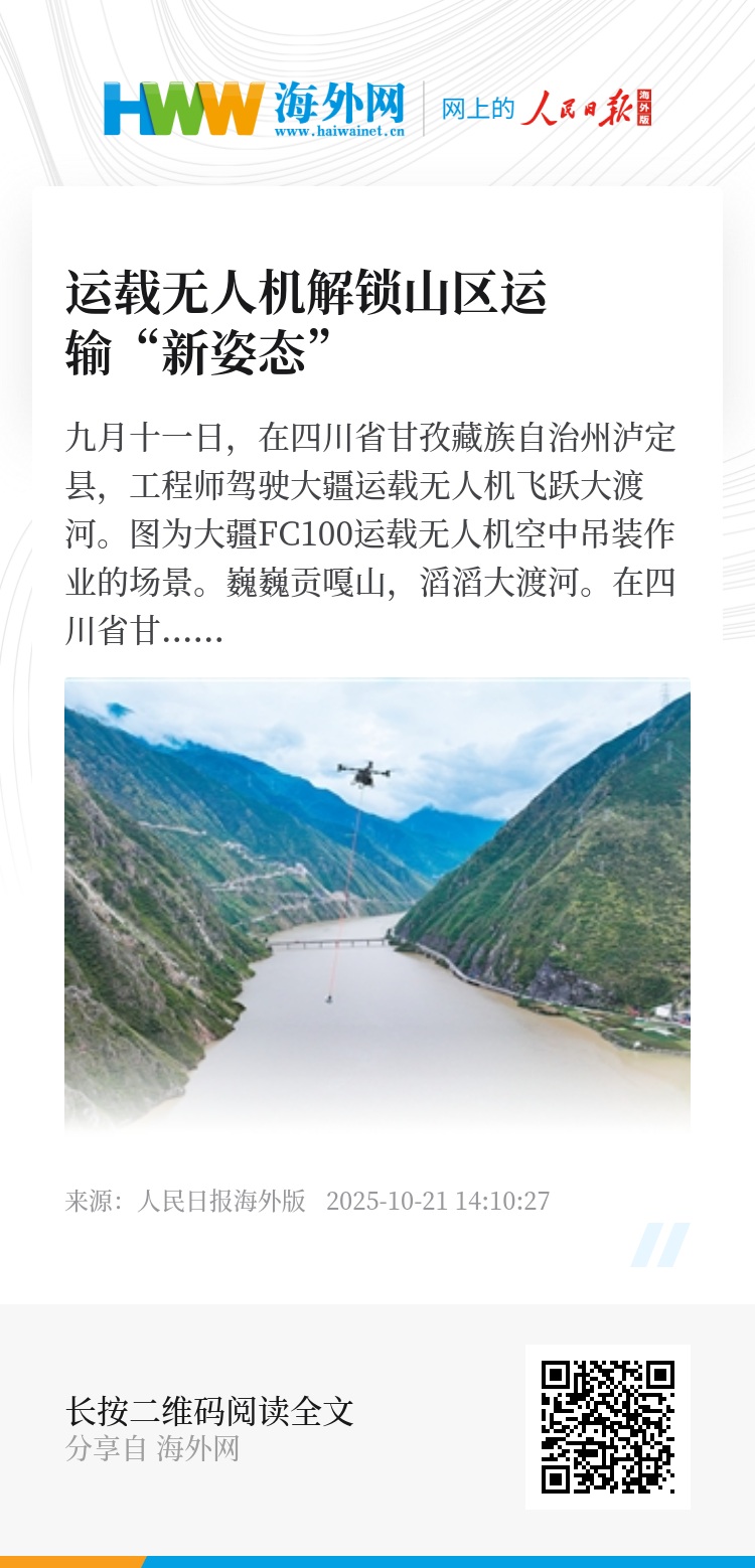 无人机在崇山峻岭间的“振翅”,带来改变的不仅是物资运输的效率,还有偏远山区的发展机遇。国产运载无人机正在打通空中运输渠道,让昔日“天堑”在碳纤维桨叶的搅动下,蜕变为“通途”的新注脚。