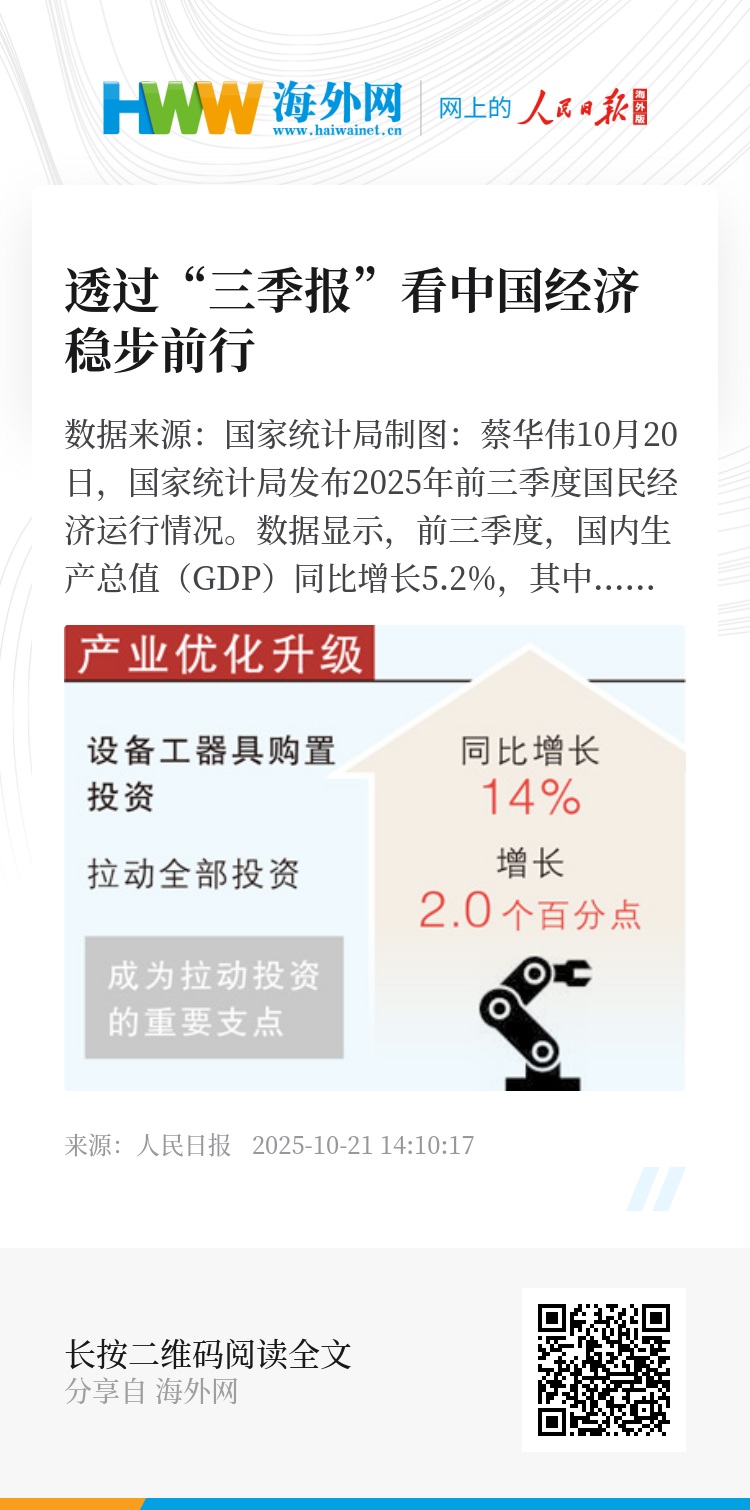 10月20日,国家统计局发布2025年前三季度国民经济运行情况。数据显示,前三季度,国内生产总值(GDP)同比增长5.2%,其中三季度GDP同比增长4.8%。从环比看,经季节因素调整后,三季度GDP环比增长1.1%,比二季度回升0.1个百分点。经济运行持续保持总体平稳、稳中有进发展态势。