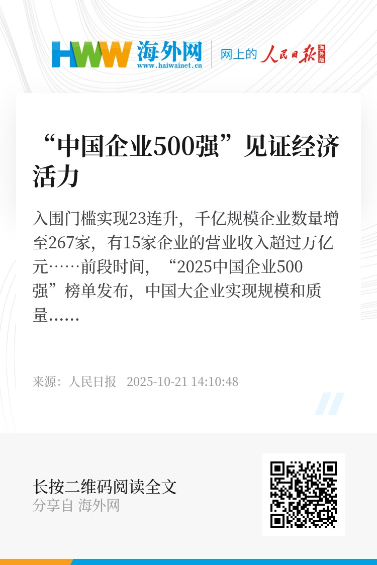 入围门槛实现23连升,千亿规模企业数量增至267家,有15家企业的营业收入超过万亿元……前段时间,“2025中国企业500强”榜单发布,中国大企业实现规模和质量双重跃升,展现着中国经济高质量发展的韧性与活力。