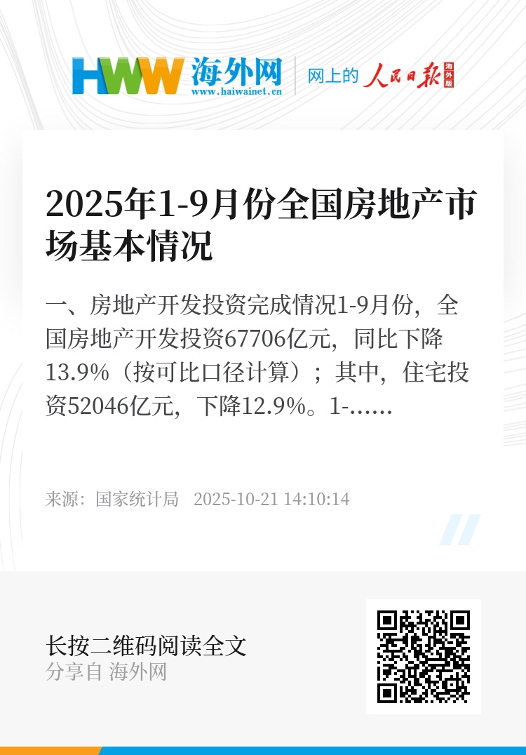 1-9月份,全国房地产开发投资67706亿元,同比下降13.9%(按可比口径计算);其中,住宅投资52046亿元,下降12.9%。