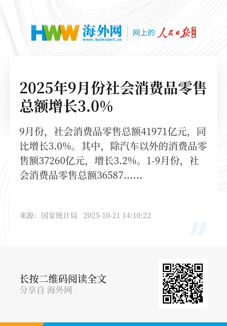 9月份,社会消费品零售总额41971亿元,同比增长3.0%。其中,除汽车以外的消费品零售额37260亿元,增长3.2%。1-9月份,社会消费品零售总额365877亿元,增长4.5%。其中,除汽车以外的消费品零售额329954亿元,增长4.9%。