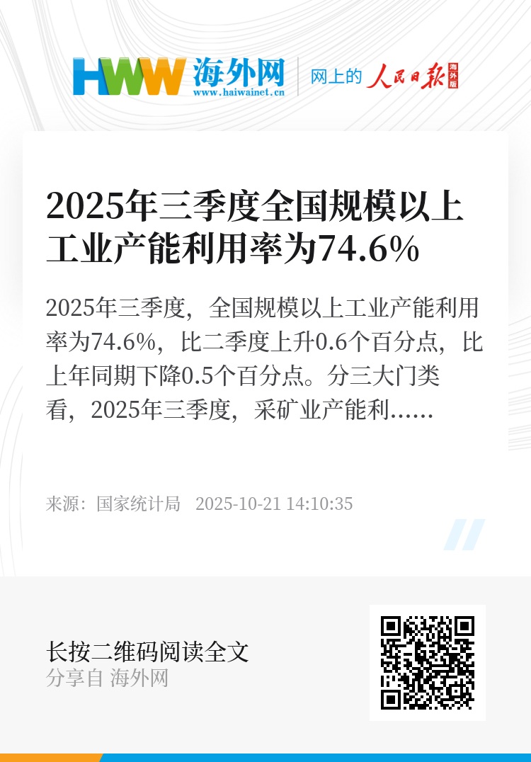 2025年三季度,全国规模以上工业产能利用率为74.6%,比二季度上升0.6个百分点,比上年同期下降0.5个百分点。