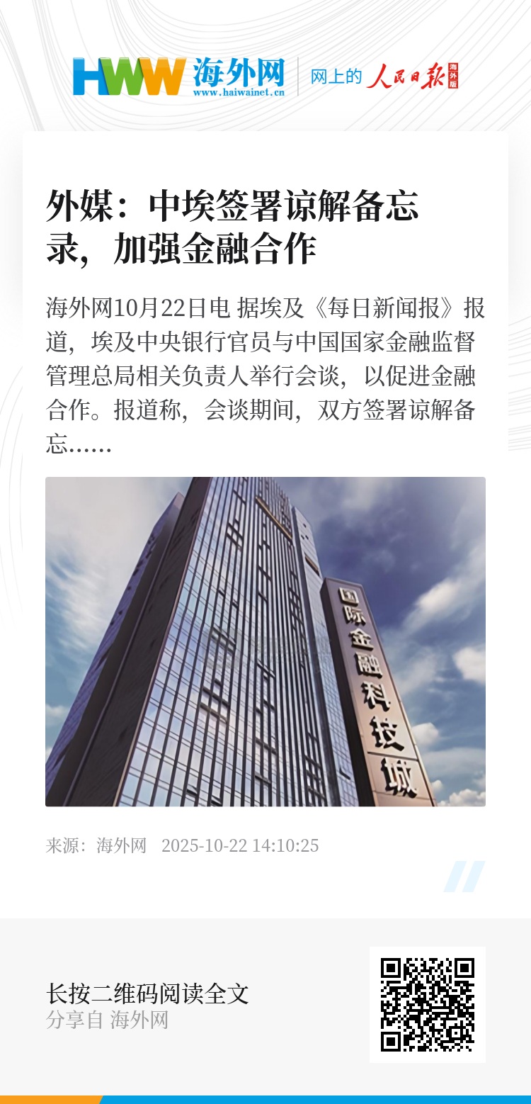 报道称,会谈期间,双方签署谅解备忘录,就银行与金融机构的许可审批、跨境机构及其业务的持续监管,以及促进双方银行体系的安全稳健开展合作。埃及官员表示,此次合作是双方金融和银行业合作的重要一步,双方还就监管金融机构的法律法规交换了意见,这将有助于加强金融稳定,支持经济可持续增长。(海外网 李芳)
