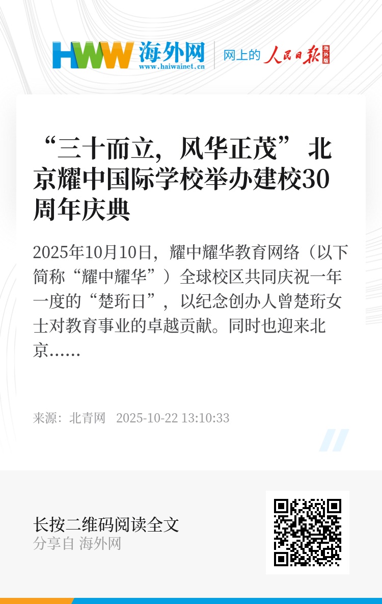 2025年10月10日,耀中耀华教育网络(以下简称“耀中耀华”)全球校区共同庆祝一年一度的“楚珩日”,以纪念创办人曾楚珩女士对教育事业的卓越贡献。同时也迎来北京耀中国际学校(以下简称“北京耀中”)建校30周年及耀华国际教育学校上海临港校区(以下简称“上海耀华临港校区”)创校10周年的重要里程碑。