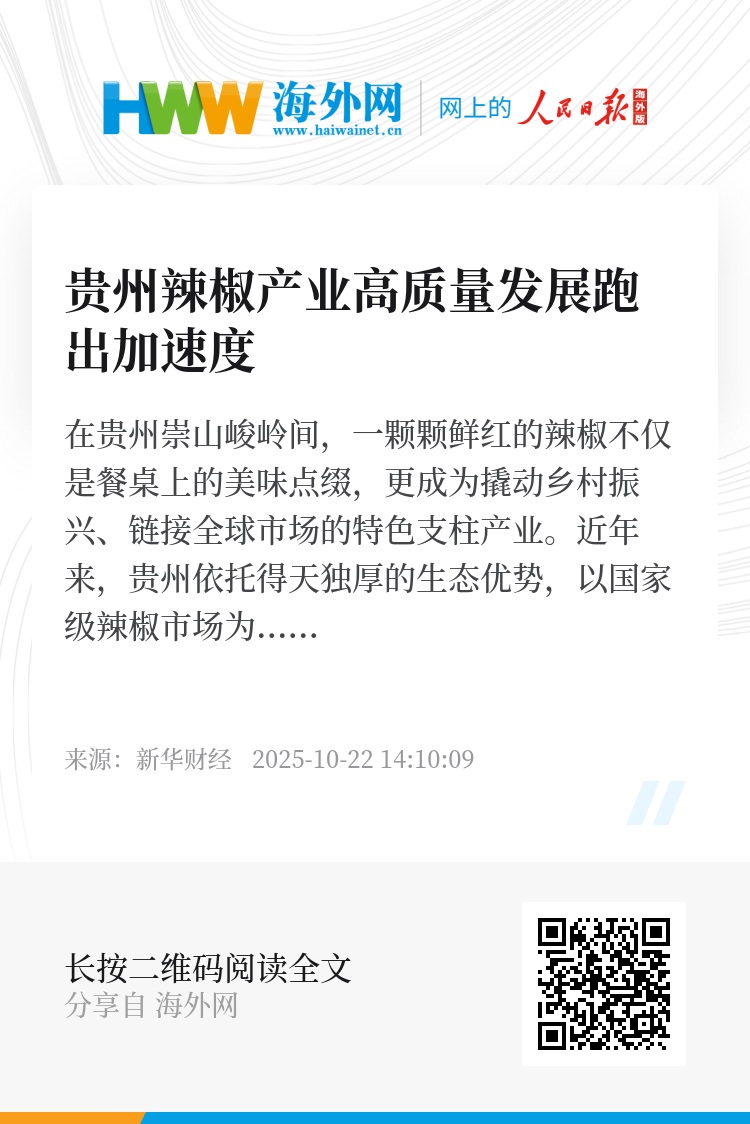 从山间“小作物”到百亿“大产业”,从区域特产到全球品牌,贵州辣椒产业的崛起,是贵州发展现代山地特色高效农业的生动缩影。随着平台建设的持续完善、数字工具的深度渗透与指数体系的不断升级,贵州辣椒必将在乡村振兴的征程中书写更加红火的篇章,让每一颗“生态贵椒”都绽放出最大价值。(李欣仪)