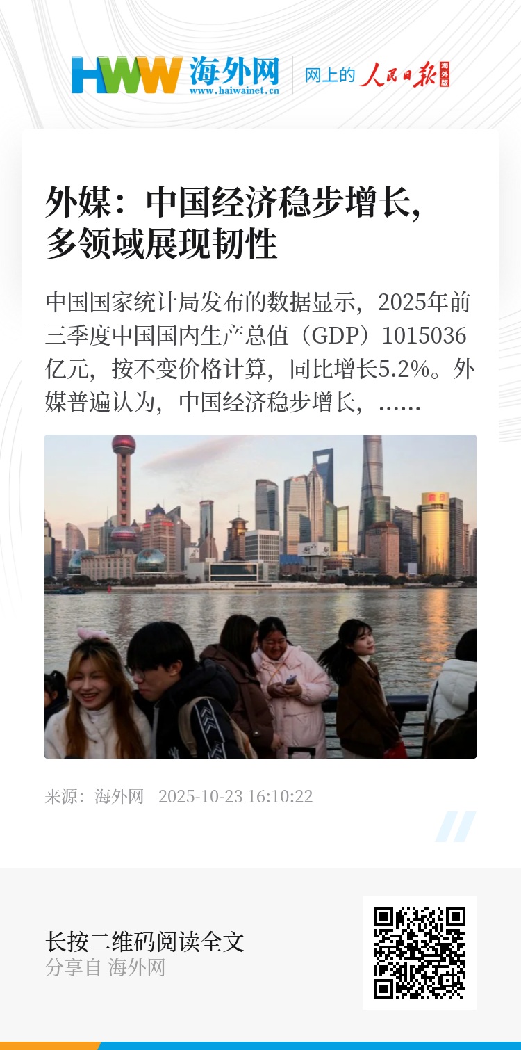 中国国家统计局发布的数据显示,2025年前三季度中国国内生产总值(GDP)1015036亿元,按不变价格计算,同比增长5.2%。外媒普遍认为,中国经济稳步增长,多领域展现韧性。