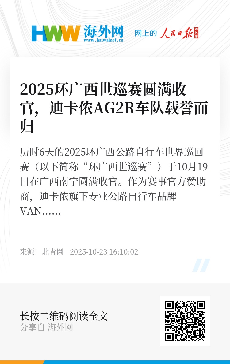 历时6天的2025环广西公路自行车世界巡回赛(以下简称“环广西世巡赛”)于10月19日在广西南宁圆满收官。作为赛事官方赞助商,迪卡侬旗下专业公路自行车品牌VAN RYSEL以科技赋能竞技,助力迪卡侬AG2R车队在多变的赛道上屡创佳绩,斩获2个赛段“敢斗奖”,车手维克多·拉菲(Victor LAFAY)荣获个人总成绩第二名,车手斯坦·德伍尔夫(Stan DEWULF)荣登爬坡积分榜第三名。