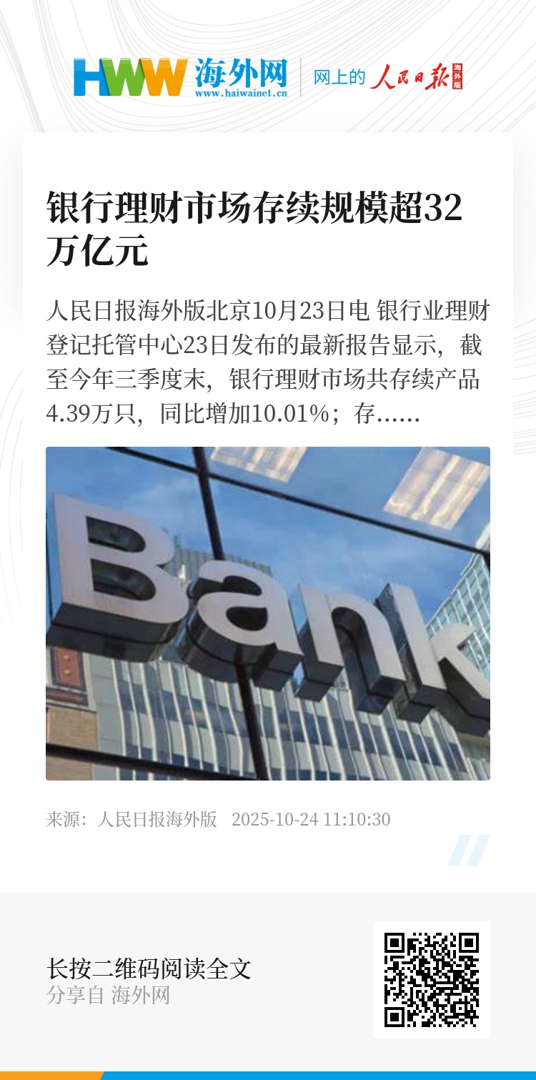 人民日报海外版北京10月23日电 银行业理财登记托管中心23日发布的最新报告显示,截至今年三季度末,银行理财市场共存续产品4.39万只,同比增加10.01%;存续规模32.13万亿元,同比增加9.42%。