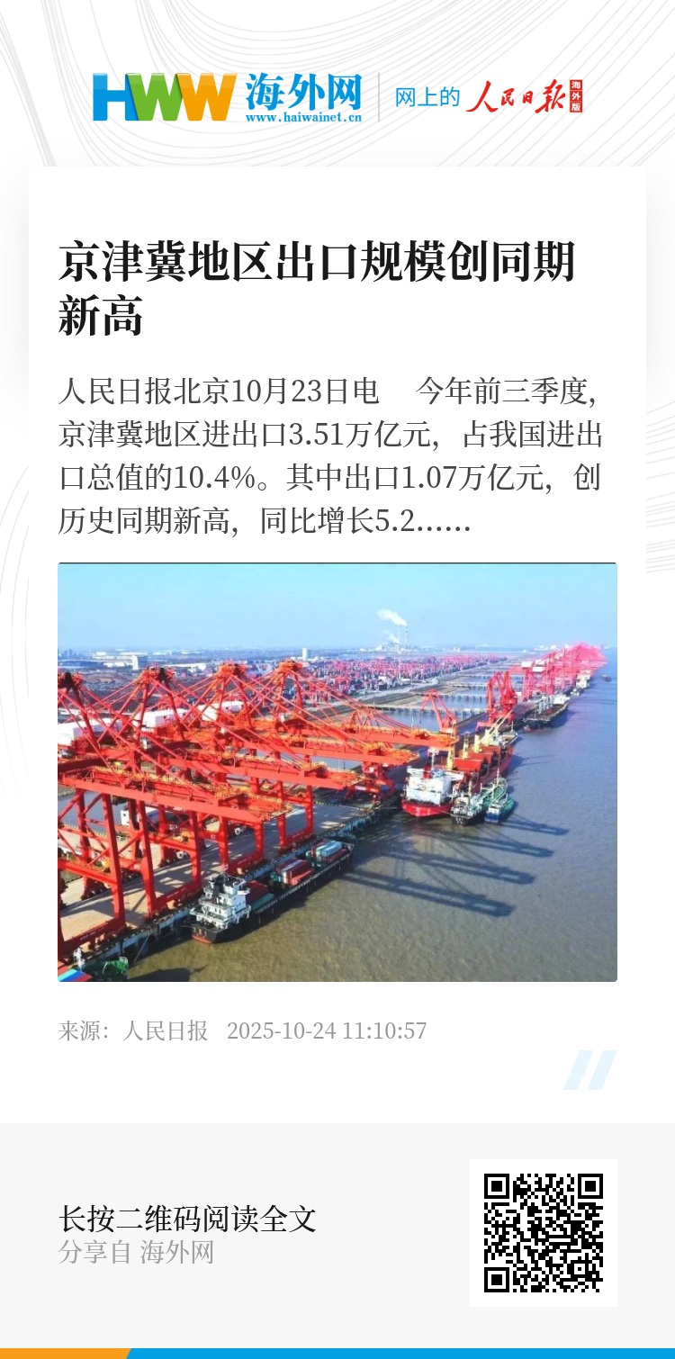 人民日报北京10月23日电 今年前三季度,京津冀地区进出口3.51万亿元,占我国进出口总值的10.4%。其中出口1.07万亿元,创历史同期新高,同比增长5.2%,连续6个月保持增长。
