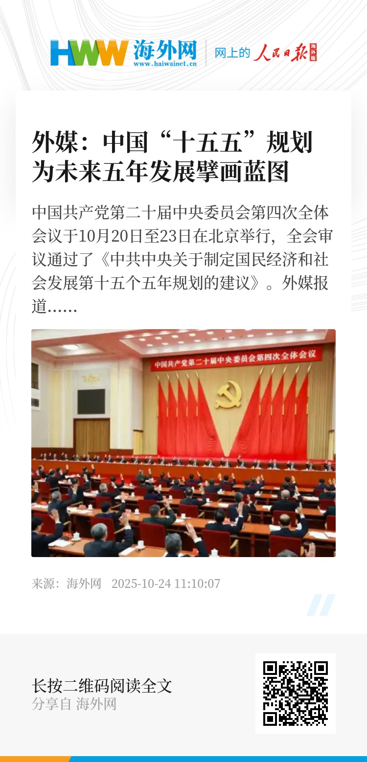 中国共产党第二十届中央委员会第四次全体会议于10月20日至23日在北京举行,全会审议通过了《中共中央关于制定国民经济和社会发展第十五个五年规划的建议》。外媒报道称,中国“十五五”规划为未来五年发展擘画蓝图,中国将重点推动产业发展和科技自立自强。