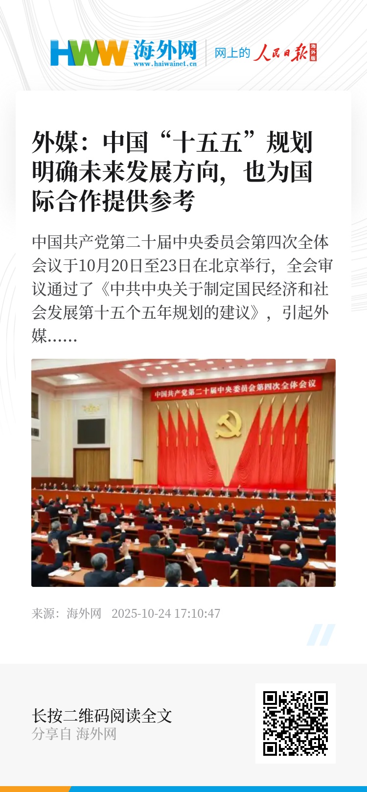 《今日巴基斯坦》刊文称,该会议的召开为中国下一阶段经济社会发展奠定基础。分析人士指出,会议的召开象征着中国进入治理更加完善、社会更加和谐、经济更加充满活力的新阶段。会议审议通过的“十五五”规划不仅明确了中国未来的发展方向,也为国际合作提供了参考。