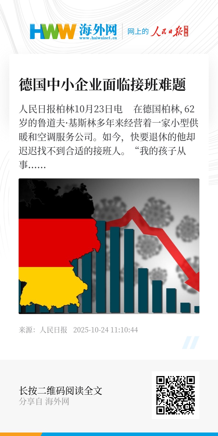 人民日报柏林10月23日电 在德国柏林,62岁的鲁道夫·基斯林多年来经营着一家小型供暖和空调服务公司。如今,快要退休的他却迟迟找不到合适的接班人。“我的孩子从事的是完全不同的行业,无法接手我的企业,部分员工又不愿意承担责任。”基斯林无奈地说。在德国,像基斯林这样面临接班难题的中小企业主不在少数。一旦找不到继承人,这些企业可能不得不关闭。