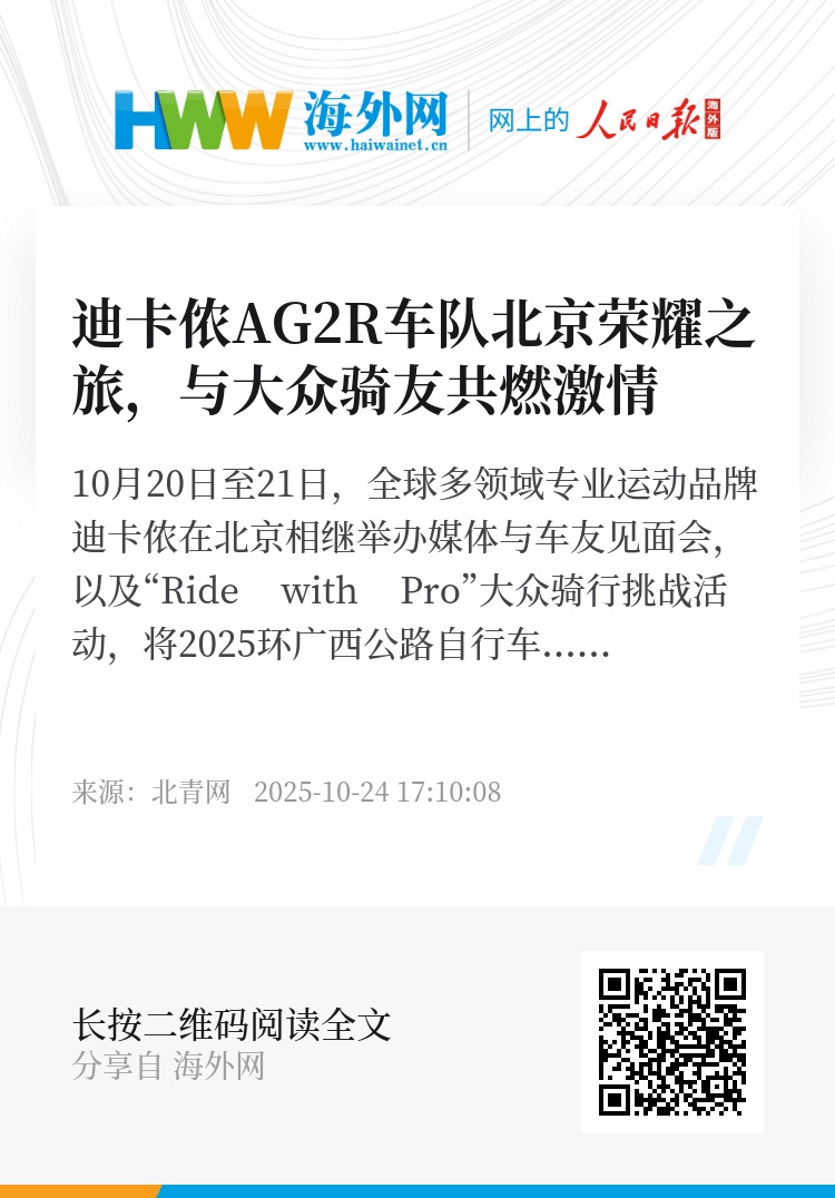 10月20日至21日,全球多领域专业运动品牌迪卡侬在北京相继举办媒体与车友见面会,以及“Ride with Pro”大众骑行挑战活动,将2025环广西公路自行车世界巡回赛(以下简称“环广西世巡赛”)的激情与热度从南国赛场延伸至京华大地。