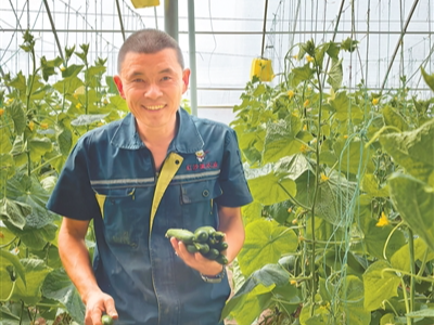 王孔会在蔬菜大棚里展示种植的黄瓜。