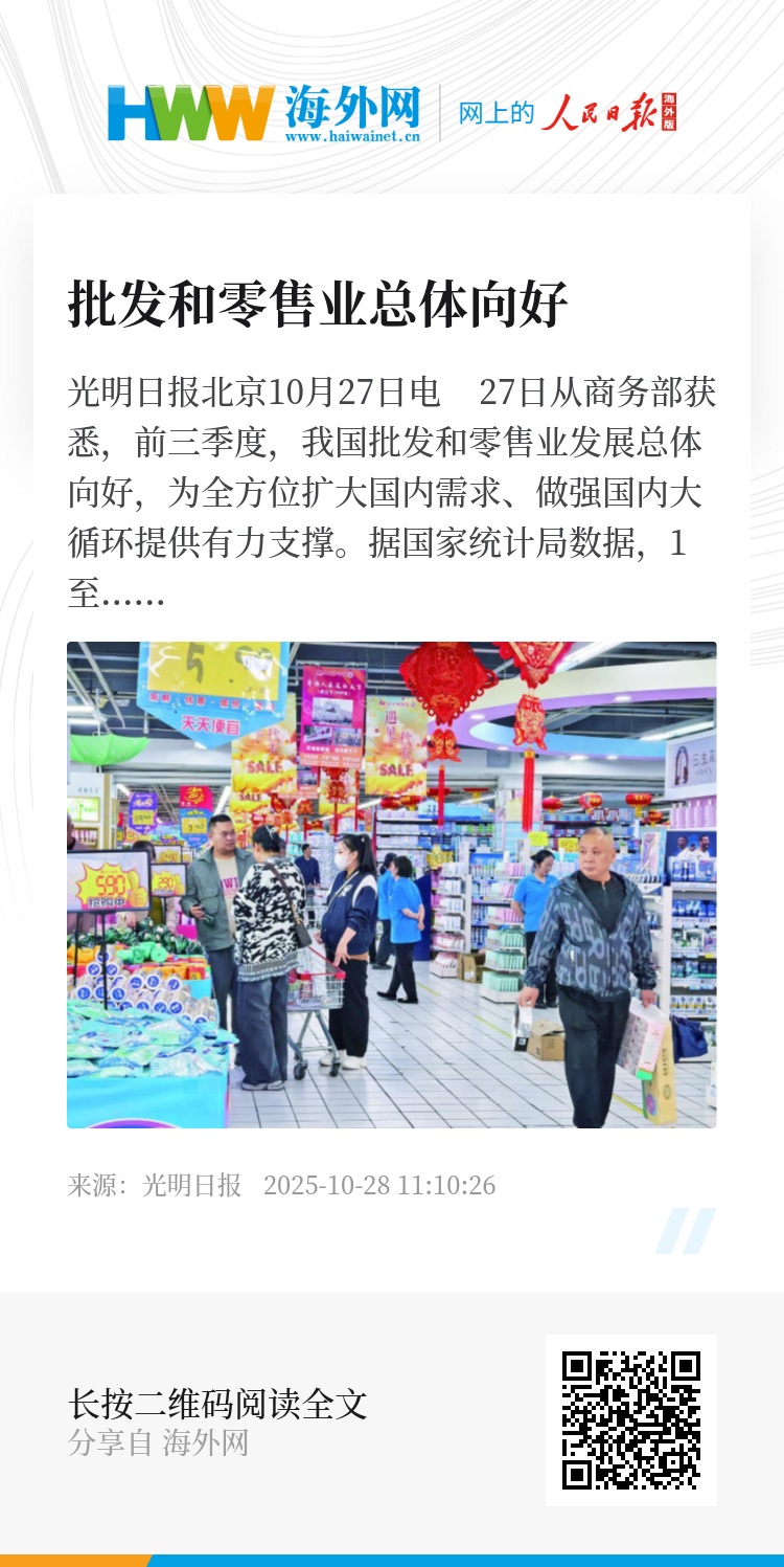 光明日报北京10月27日电 27日从商务部获悉,前三季度,我国批发和零售业发展总体向好,为全方位扩大国内需求、做强国内大循环提供有力支撑。