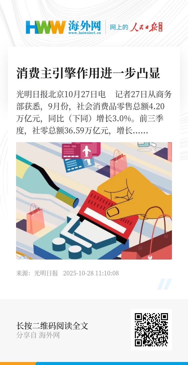 光明日报北京10月27日电 记者27日从商务部获悉,9月份,社会消费品零售总额4.20万亿元,同比(下同)增长3.0%。前三季度,社零总额36.59万亿元,增长4.5%,增速比去年全年加快1.0个百分点;最终消费支出对经济增长的贡献率达53.5%,消费主引擎作用进一步凸显。
