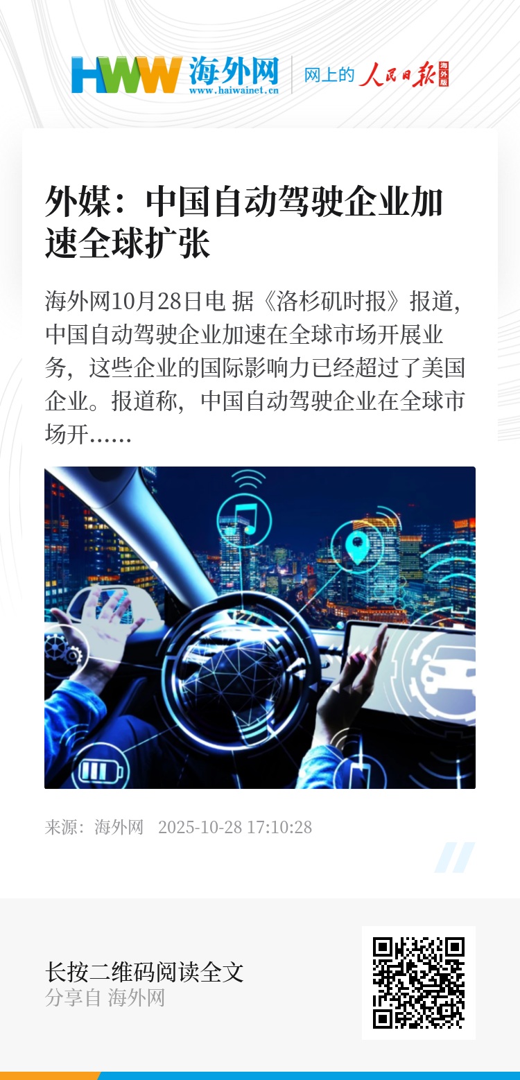 海外网10月28日电 据《洛杉矶时报》报道,中国自动驾驶企业加速在全球市场开展业务,这些企业的国际影响力已经超过了美国企业。