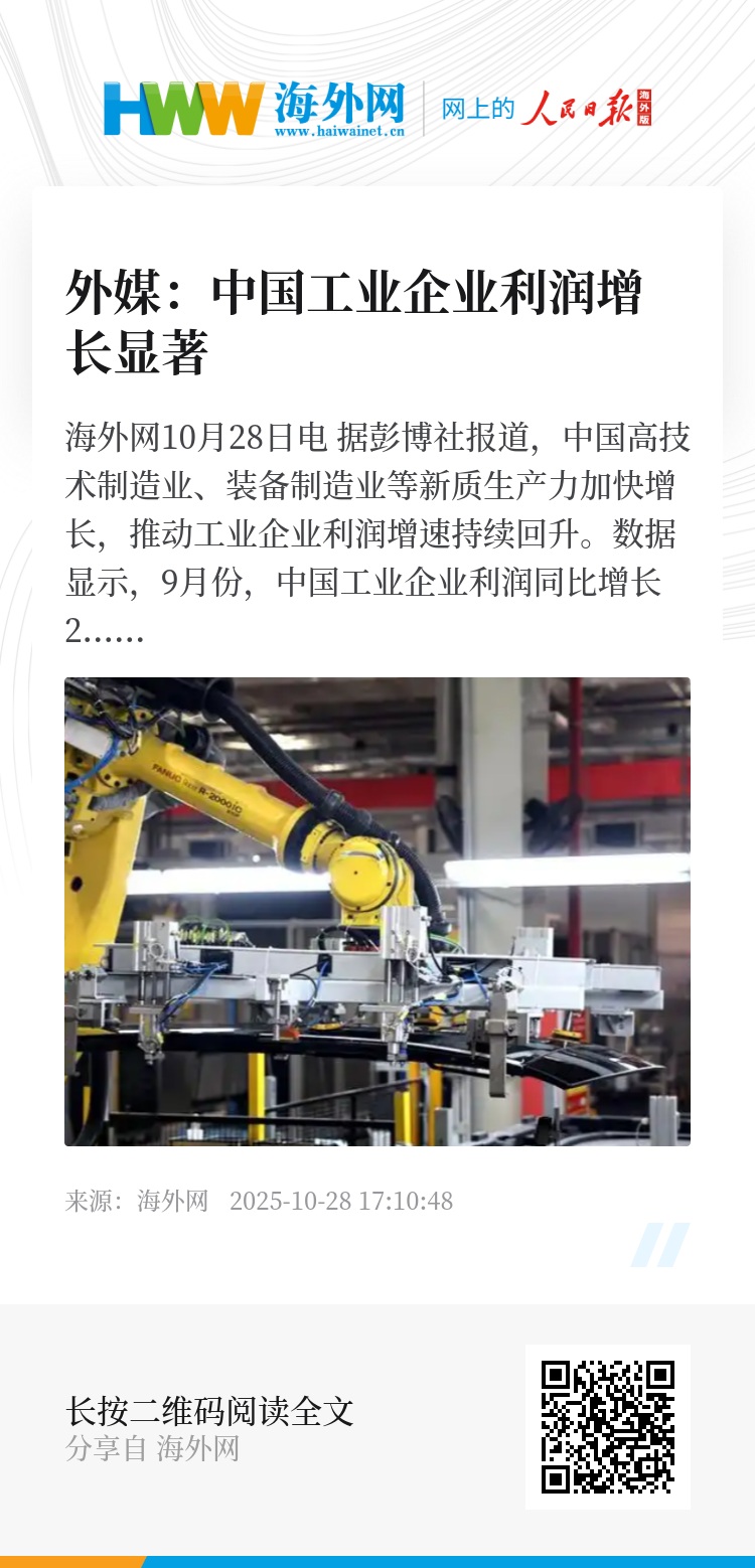 报道说,中国海外市场需求保持强劲,中国企业正在扩大生产,盈利水平不断提高。据悉,中国正培育壮大新经济增长点,大力推动高技术制造业、装备制造业等新质生产力,规模以上工业企业利润增速明显回升。(海外网 李芳)
