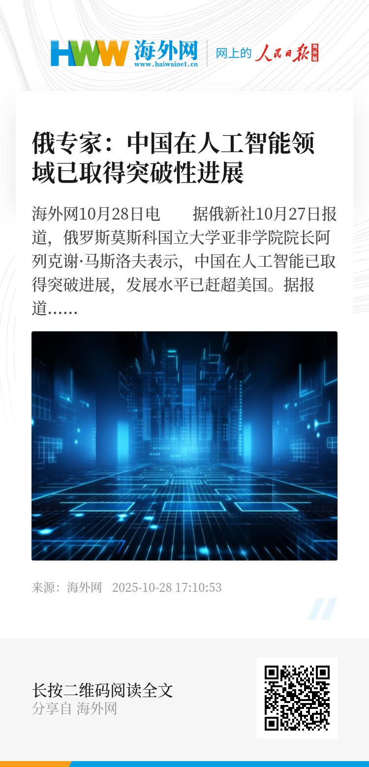 海外网10月28日电 据俄新社10月27日报道,俄罗斯莫斯科国立大学亚非学院院长阿列克谢·马斯洛夫表示,中国在人工智能已取得突破进展,发展水平已赶超美国。